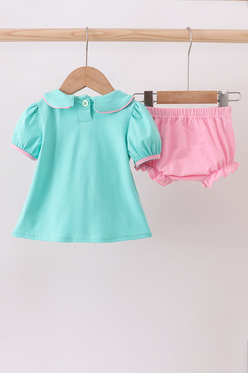 Celebrate the holiday spirit with this playful Green Christmas Tree Embroidery Bloomer Set. Featuring charming embroidered Christmas trees, this set adds festive cheer and cozy comfort for little ones. Perfect for holiday photos and seasonal fun, it combines cute style with easy wearability.